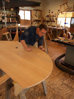 One reason I decided to take up making furniture professionally was that I figured that I would never get bored with it. After 22 years I find that this is still true. I used to always want to be making something different but I find that I do enjoy routine such as making sets of chairs. During the more routine work, I listen to Public Radio, books on tape or even put on a DVD as long as it is high on dialogue and not subtitled. That being said, it is good to be challenged once in a while. A few times a year I get custom orders that keep me thinking. The radio is off and the calculator is out figuring and refiguring dimensions to make sure that everything fits. This latest job is a Hunt Table or Irish Wake Table and will be headed to Ireland when I finish it up. This table has a few challenges. The oval shape, matching the wood across the wide table surface, keeping it flat and true, the rule joint for the large leaves, and designing the double gate-leg hinge mechanism that will support the leaves and close cleanly to the under-structure of the table. I love the graceful shape of the table top. So far that is as far as I have gotten.